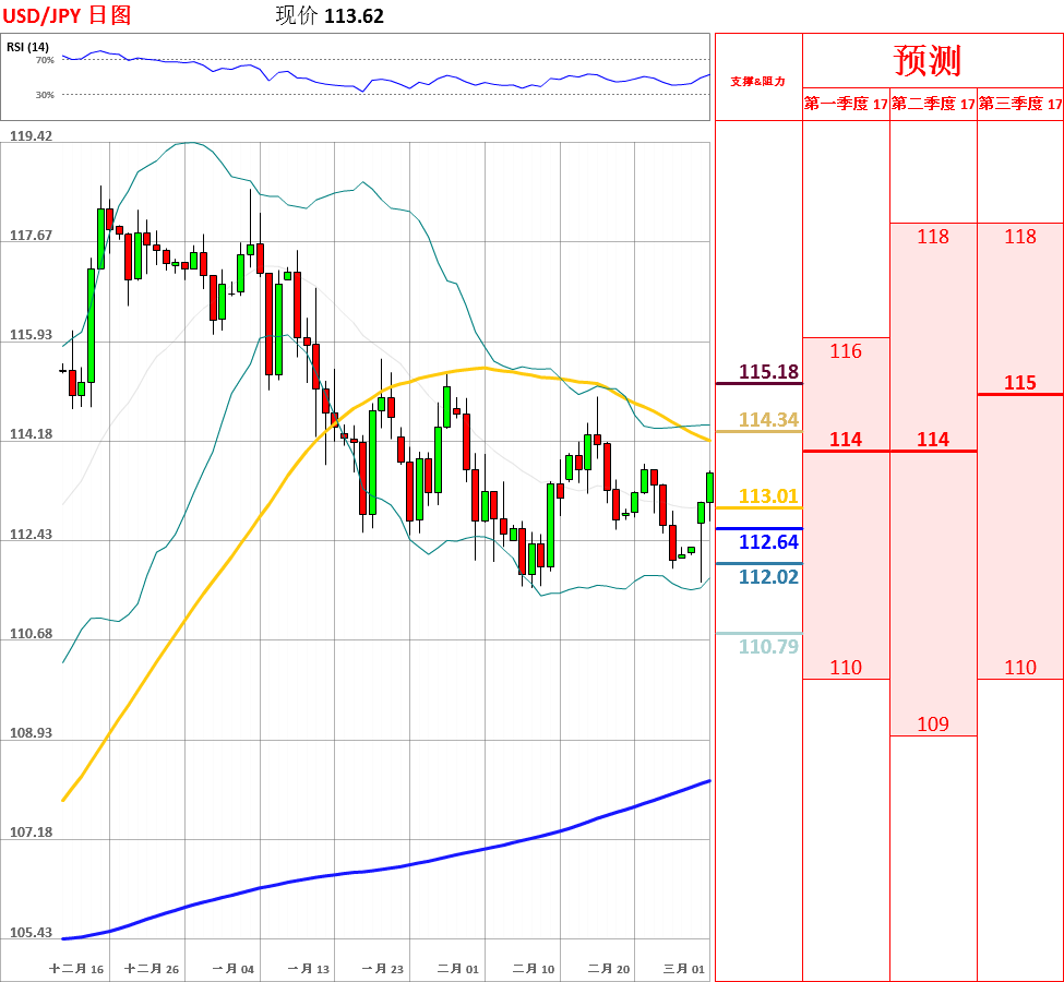 昨日,美元兑日元跌至100日均线后反弹,收了十字星线,这已是第三次受到100日均线的支撑。目前,短中期均线粘合,日线MACD快线及慢线基本持平,短期走势以区间震荡为主,震荡区域为100日均线至60日均线。今日,上方关注上周高点113.78阻力位,下方关注112.50支撑位。如果向上突破113.78,汇率将测试114.00关口;但如若跌破112.50,美元/日元将再次试探100日均线主要支撑位。