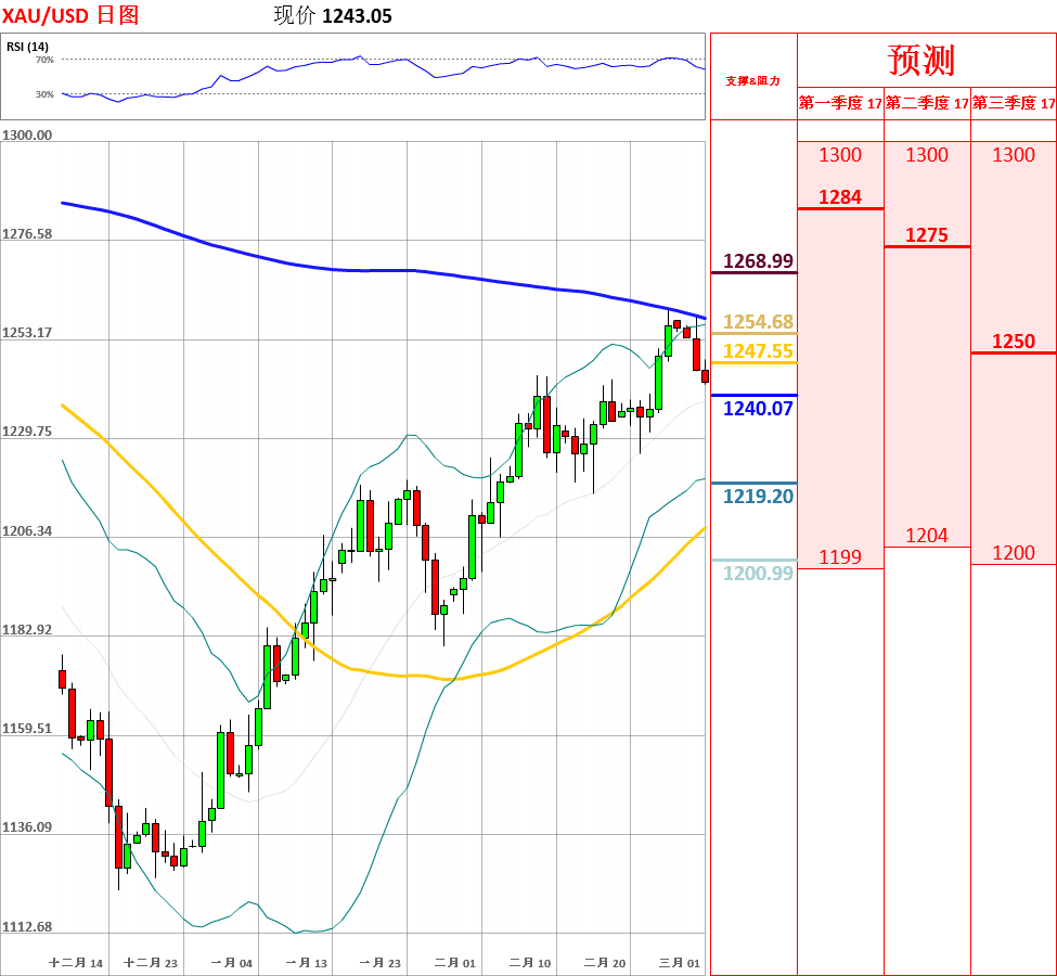 昨日,黄金冲高回落,收了带有上影线的阴线。目前,短期走势震荡偏多,但鉴于日线、4小时动能指标拐头向下,因此不排除继续回调的可能性。今日,上方关注1250.00阻力位,下方关注10日均线支撑位。如果向上突破1250.00,金价将再次测试200日均线主要阻力位;但如若跌破10日均线,黄金将试探布林带中轨主要支撑位。今日公布美国2月Markit制造业PMI终值和2月ISM制造业PMI。