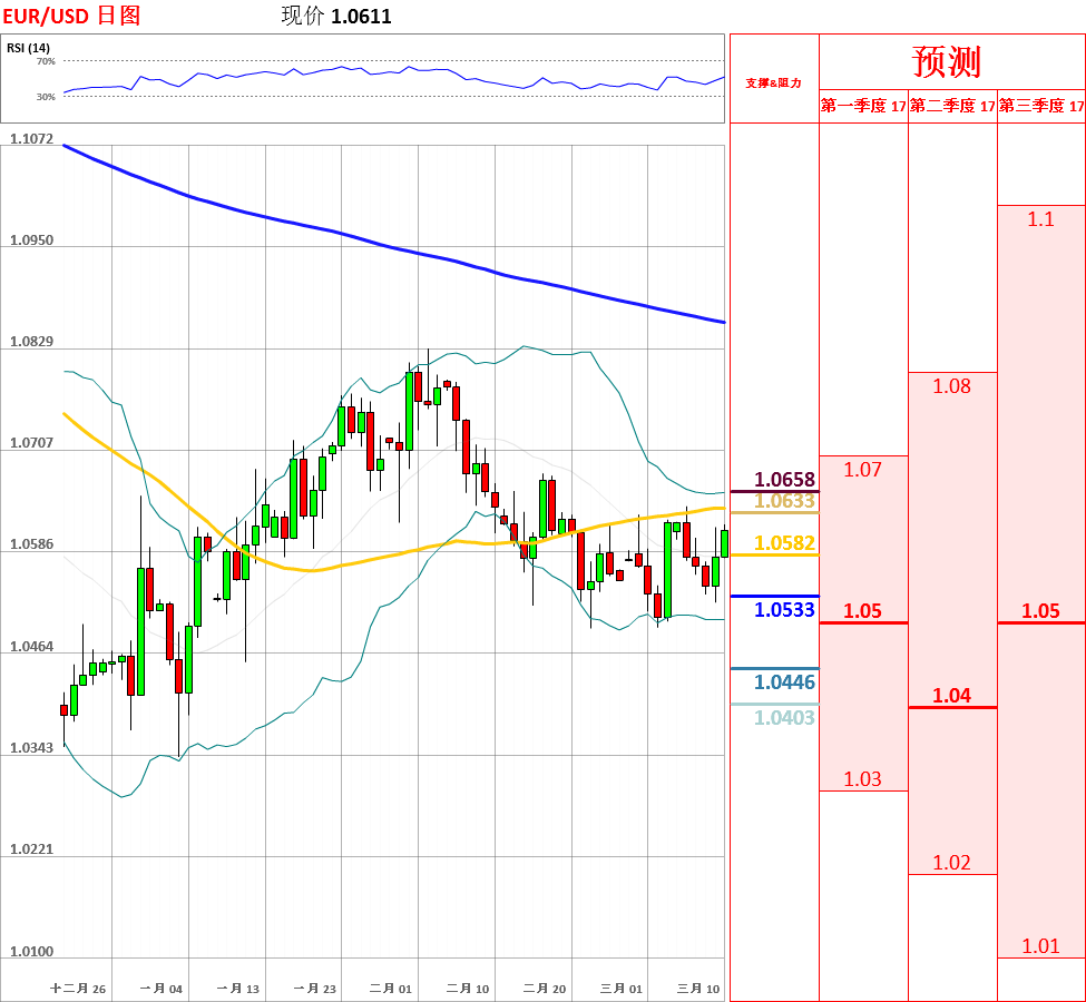 昨日,受到欧洲央行利率决议和行长德拉吉发言的影响,欧元兑美元在1.0520附近止跌反弹,收了带有长上影线的阳线。目前,短中期均线粘合,短期走势总体以区间震荡为主。今日,上方关注昨日高点1.0615阻力位,下方关注短期均线支撑位。如果向上突破1.0615,汇率将测试本周高点1.0640的阻力;但如若跌破短期均线,欧元/美元将再次试探1.0520支撑位。