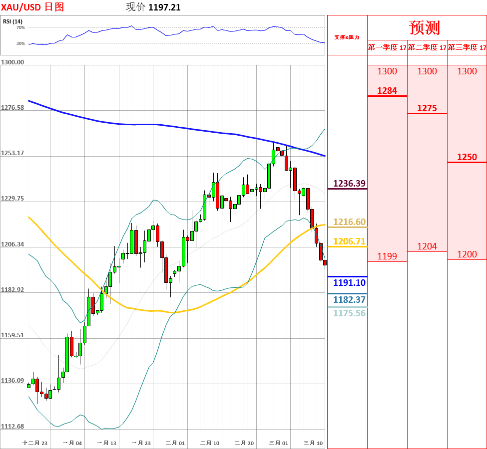 昨日,黄金震荡下跌,一度向下突破1200.00关口,收了阴线。最近,市场对美联储3月加息预期接近100%,其令黄金承压。目前,短期均线形成空头排列,走势震荡偏空。但是,鉴于日线、4小时动能指标超卖,因此不排除反弹的可能性。今日,上方关注100日均线阻力位,下方关注1195.00支撑位。如果向上突破100日均线,金价将测试1210.00主要阻力位;但如若跌破1195.00,黄金将试探1190.00支撑位。今日重点关注美国2月失业率和2月季调后非农就业人口。