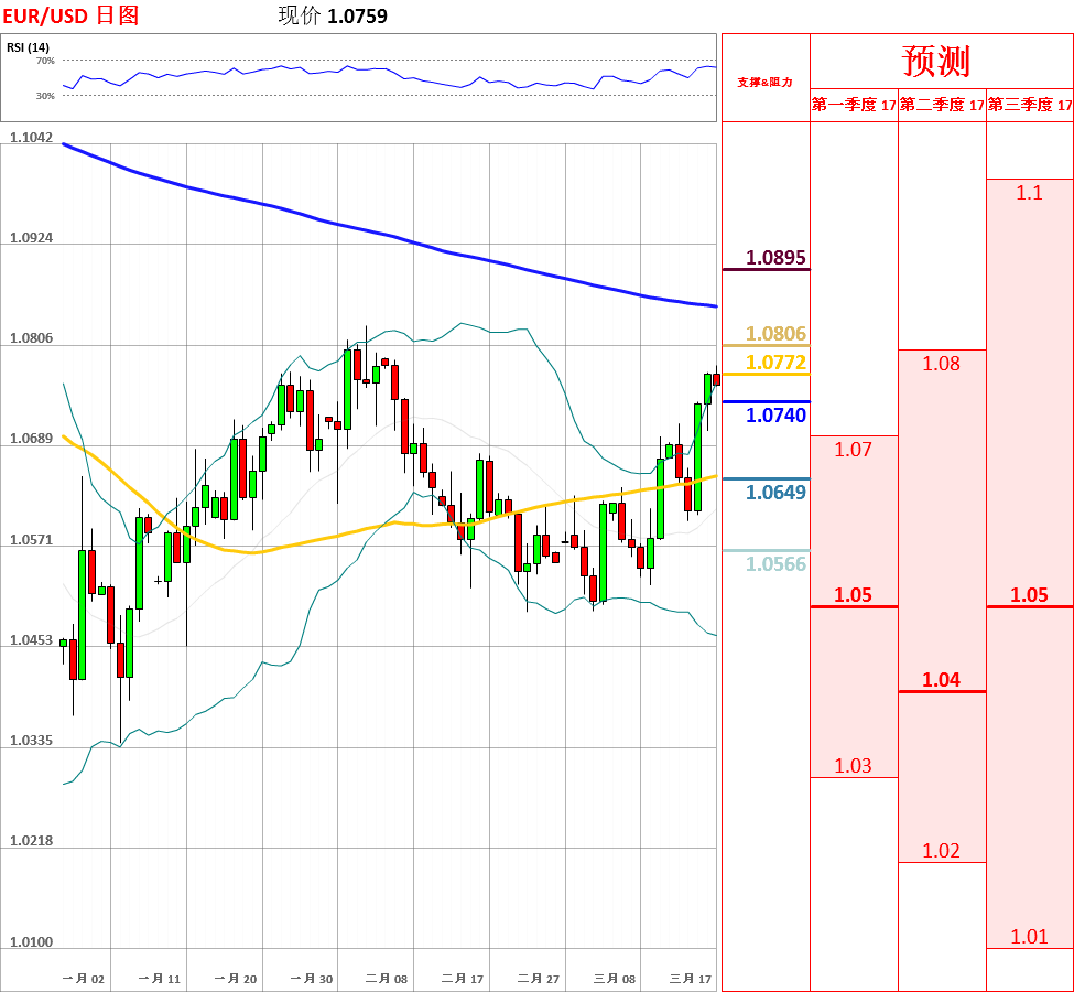 昨日,美元继续走弱,欧元兑美元震荡反弹,收了带有下影线的阳线。目前,短期均线呈多头排列,短期走势震荡偏多。但是,鉴于日线、4小时动能指标超买,因此不排除回调的可能性。今日,上方关注1.0800阻力位,下方关注1.0740支撑位。如果向上突破1.0800,汇率将测试今年高点1.0829主要阻力位;但如若跌破1.0740,欧元/美元将试探5日均线的支撑。