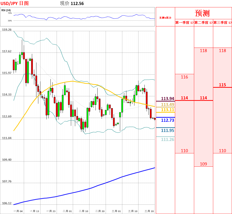 周五,美元兑日元单边下跌,一度向下突破100日均线,收了阴线,周线收了大阴线。目前,短期走势总体以区间震荡为主,但鉴于5日、10日均线拐头向下,因此不排除进一步回落的可能性。今日,上方关注100日均线主要阻力位,下方关注112.00关口。如果向上突破100日均线,汇率将测试布林带中轨的阻力;但如若跌破112.00,美元/日元试探震荡区域下沿111.59主要支撑位。