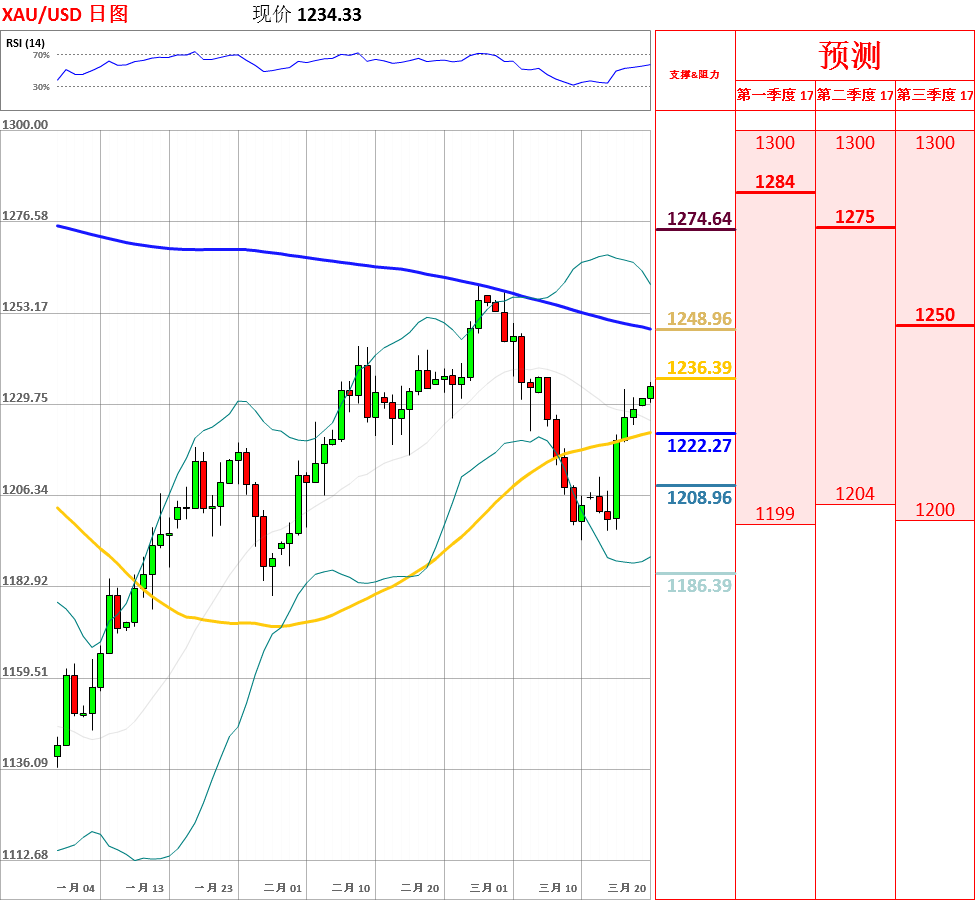 周五,黄金震荡上行,一度向上突破20日均线,收了小阳线,周线收了大阳线。上周,受到,美联储鸽派加息和美元走弱的影响,金价触底反弹。目前,5日、10日均线拐头向上,短期内或继续走强,但鉴于4小时MACD出现顶背离,因此不排除回调的可能性。今日,上方关注1240.00关口,下方关注20日均线支撑位。如果向上突破1240.00,金价将测试61.80%回撤率1249.20主要阻力位;但如若跌破20日均线,黄金将试探布林带中轨的支撑。
