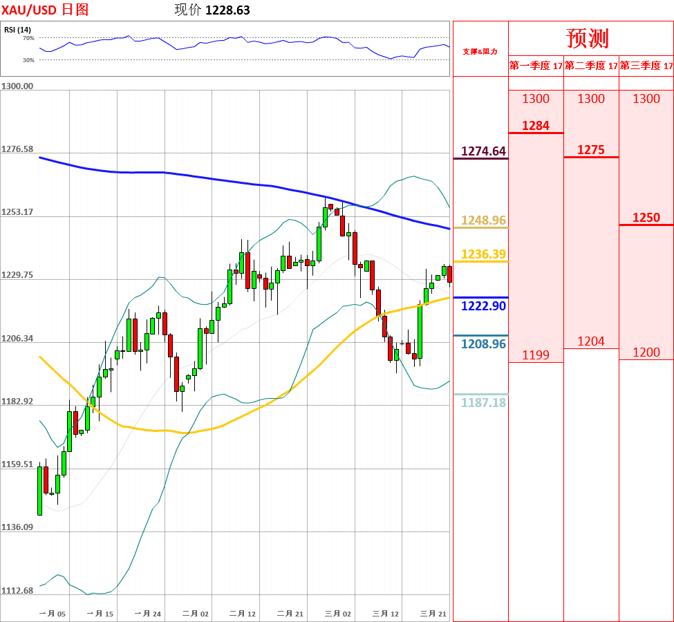 昨日,黄金震荡上行,收了小阳线,连续4日收阳。近期,随着美联储鸽派加息之后,美元走弱,金价触底反弹。目前,短期均线拐头向上,价格或继续反弹。但是,鉴于日线动能指标超买,4小时MACD出现顶背离,因此不排除下跌的可能性。今日,上方关注昨日高点1235.47阻力位,下方关注布林带中轨支撑位。如果向上突破昨日高点,金价将测试1240.00关口;但如若跌破布林带中轨,黄金将试探1220.00的支撑。