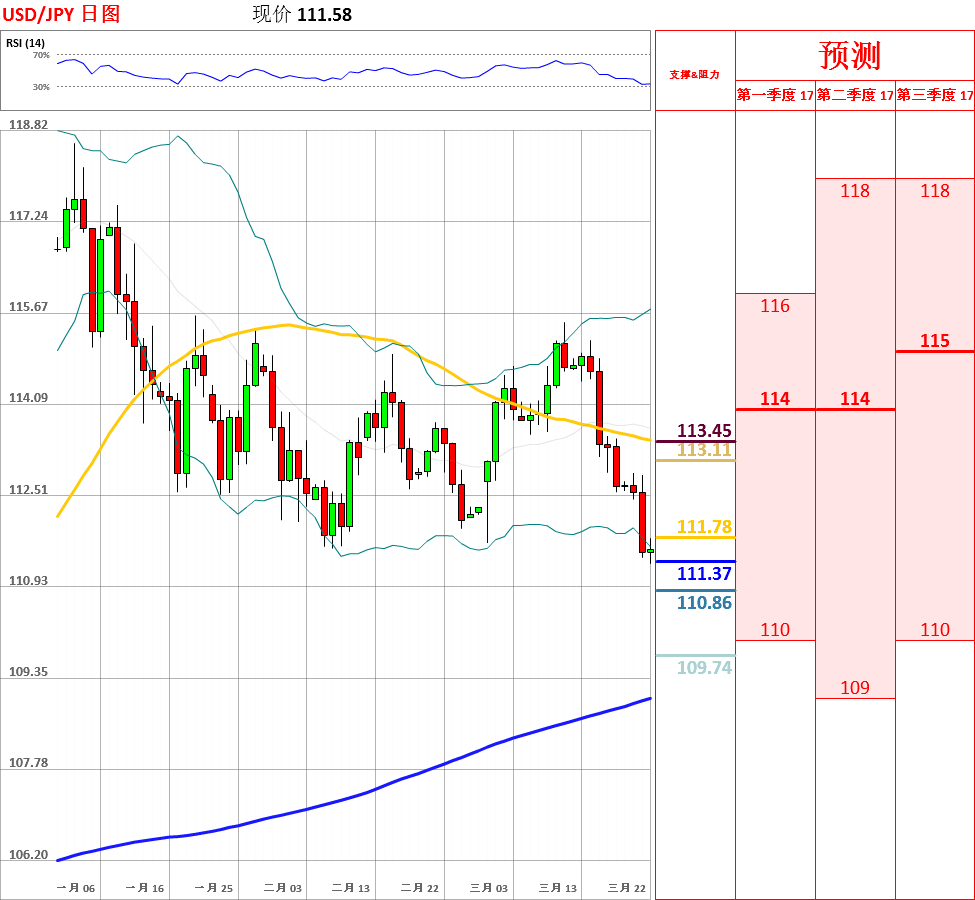 昨日,美元兑日元单边下跌,一度向下突破短期震荡区域,收了阴线。目前,短期均线形成空头排列,走势或由区间震荡转空。但是,鉴于日线、4小时动能指标超卖,因此不排除反弹的可能性。今日,上方关注5日均线阻力位,下方关注111.00支撑位。如果向上突破5日均线,汇率将测试昨日高点112.87阻力位;但如若跌破111.00,美元/日元将试探110.50和110.00的支撑。