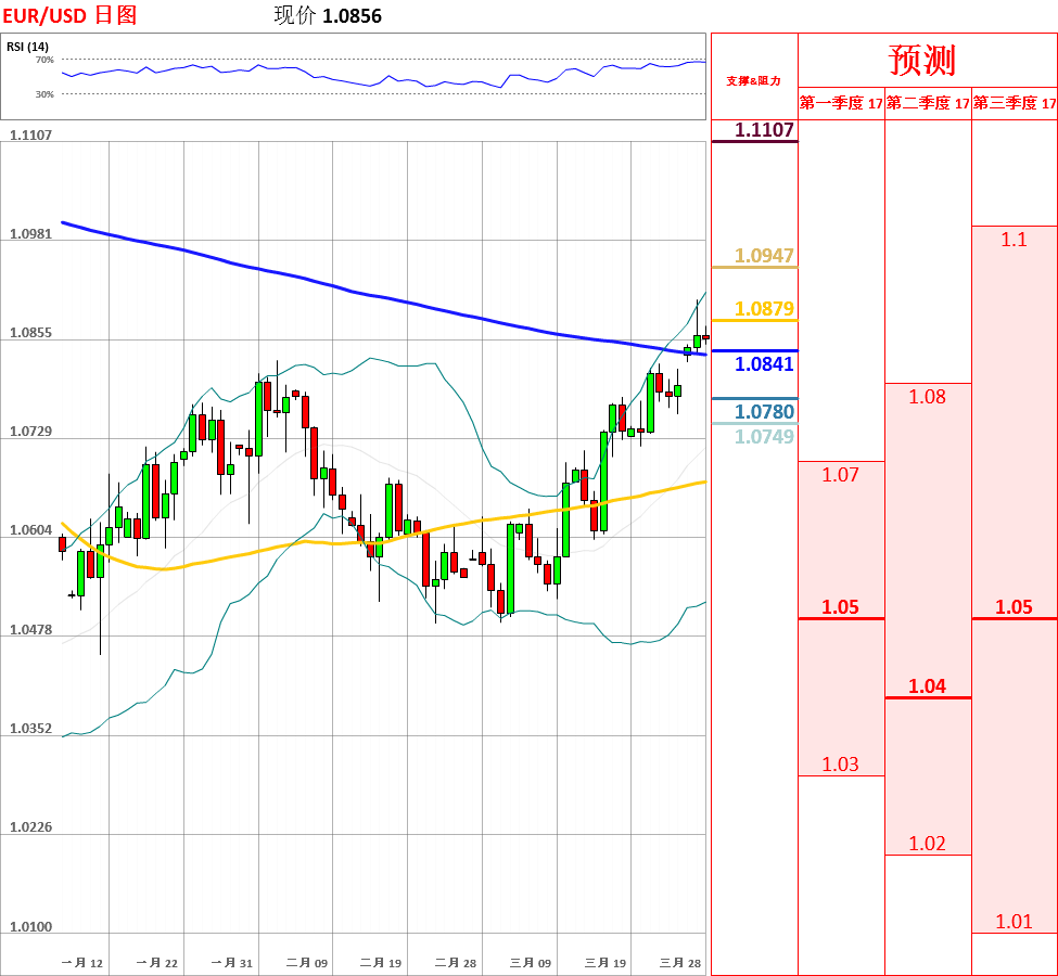 昨日,受到特朗普撤回医改方案在众议院投票的影响,欧元兑美元高开高走,一度向上突破200日均线,但未能站稳,收了带有上影线的阳线。目前,短中期均线呈多头排列,短期走势震荡偏多。但是,鉴于日线动能指标超买,4小时动能指标拐头向下,因此不排除回调的可能性。今日,上方关注昨日高点1.0906阻力位,下方关注5日均线支撑位。如果向上突破昨日高点,汇率将测试1.0950和1.1000关口;但如若跌破5日均线,欧元/美元将试探10日均线的支撑。