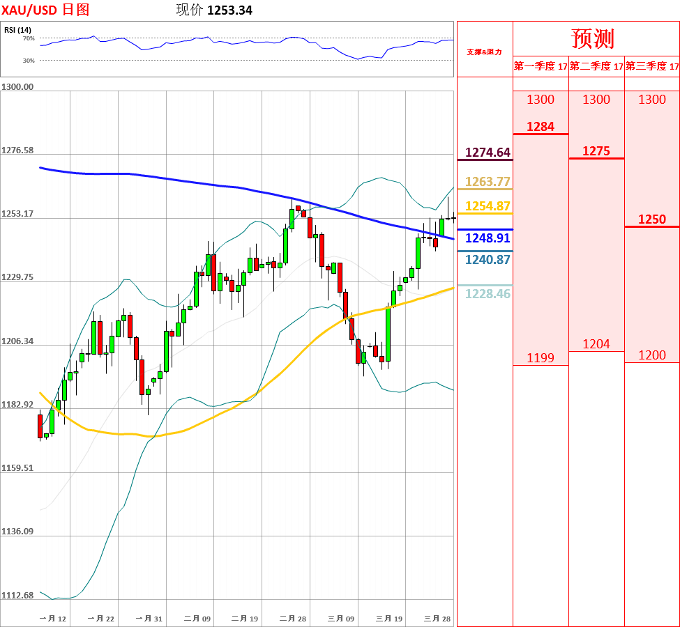 昨日,受到特朗普普撤回医改方案在众议院投票的影响,黄金震荡上行,一度向上突破200日均线,但未能站稳,收了带有上影线的阳线。目前,短中期均线呈多头排列,短期走势震荡偏多。但是,鉴于日线动能指标超买,4小时MACD出现顶背离,因此不排除回调的可能性。今日,上方关注昨日高点1261.01阻力位,下方关注5日均线支撑位。如果向上突破昨日高点,金价将测试今年高点1263.83主要阻力位;但如若跌破5日均线,黄金将试探10日均线的支撑。