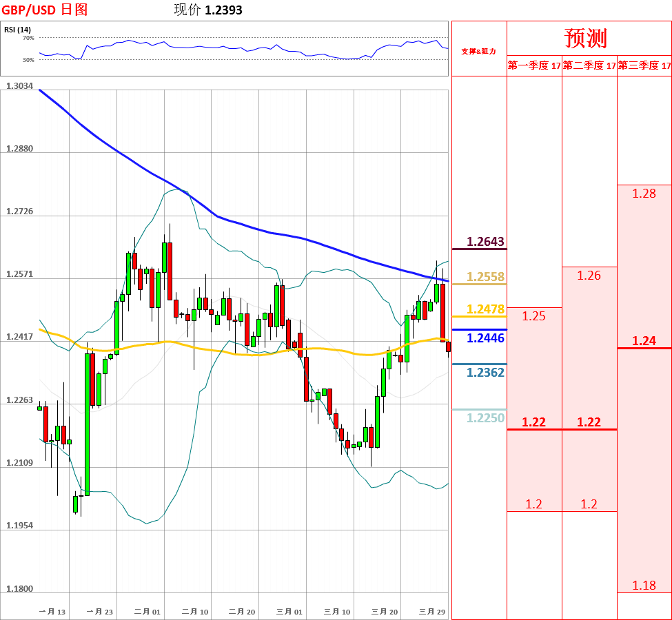 昨日,苏格兰议会以69-59票支持发起新一轮独立公投,时间暂定于2018年秋季到2019年春季,首次影响英镑/美元滞涨下跌,一度向下突破短期均线,收了中阴线。目前,短期走势震荡偏多,但鉴于日线、4小时动能指标专空,因此不排除进一步下跌的可能性。今日,上方关注5日均线阻力位,下方关注20日均线支撑位。如果向上突破5日均线,汇率将再次测试1.2600关口;但如若跌破20日均线,英镑/美元将试探1.2300支撑位。今日,英国将启动《里斯本条约》第50条,开始为期两年的脱欧谈判。