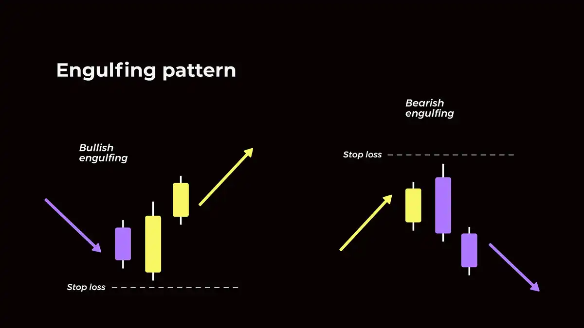 Bullish and bearish engulfing patterns are strong reversal signals. A bullish engulfing occurs when a larger green candle completely engulfs the previous red candle. The opposite forms a bearish engulfing. These patterns are particularly powerful when found at support or resistance levels.