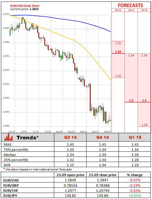 Manufacturing activity in the single currency area registered only minor changes in September, as the benchmark purchasing managers' index for this particular sector decreased from 50.5 in August to 50.4 points this month. While indicator for Germany declined more considerably, French gauge increased in value, however, remained below the 50-points threshold at 48.8. The reading above this point indicates expansion, while the mark below 50 points is pointing on downturn in activity. At the same time, the PMI indicator for services sector in the Eurozone fell from 53.2 points to a 52.8 mark in September. For this industry, better performance was showed by Germany, rather than France.