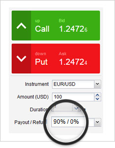 Besides the standard base payout of 90% for Binary Options that does not assume any refund in case of forecast failure (i.e. option expiring Out-of-the-Money) Dukascopy Bank offers clients an option to select between predefined sets Payout/Refund combinations that best correspond to their individual risk tolerance. This means clients may select a lower-than-base payout ratio (lower than maximum) in exchange of a refund of part of the premium in case the contract expires with a loss.