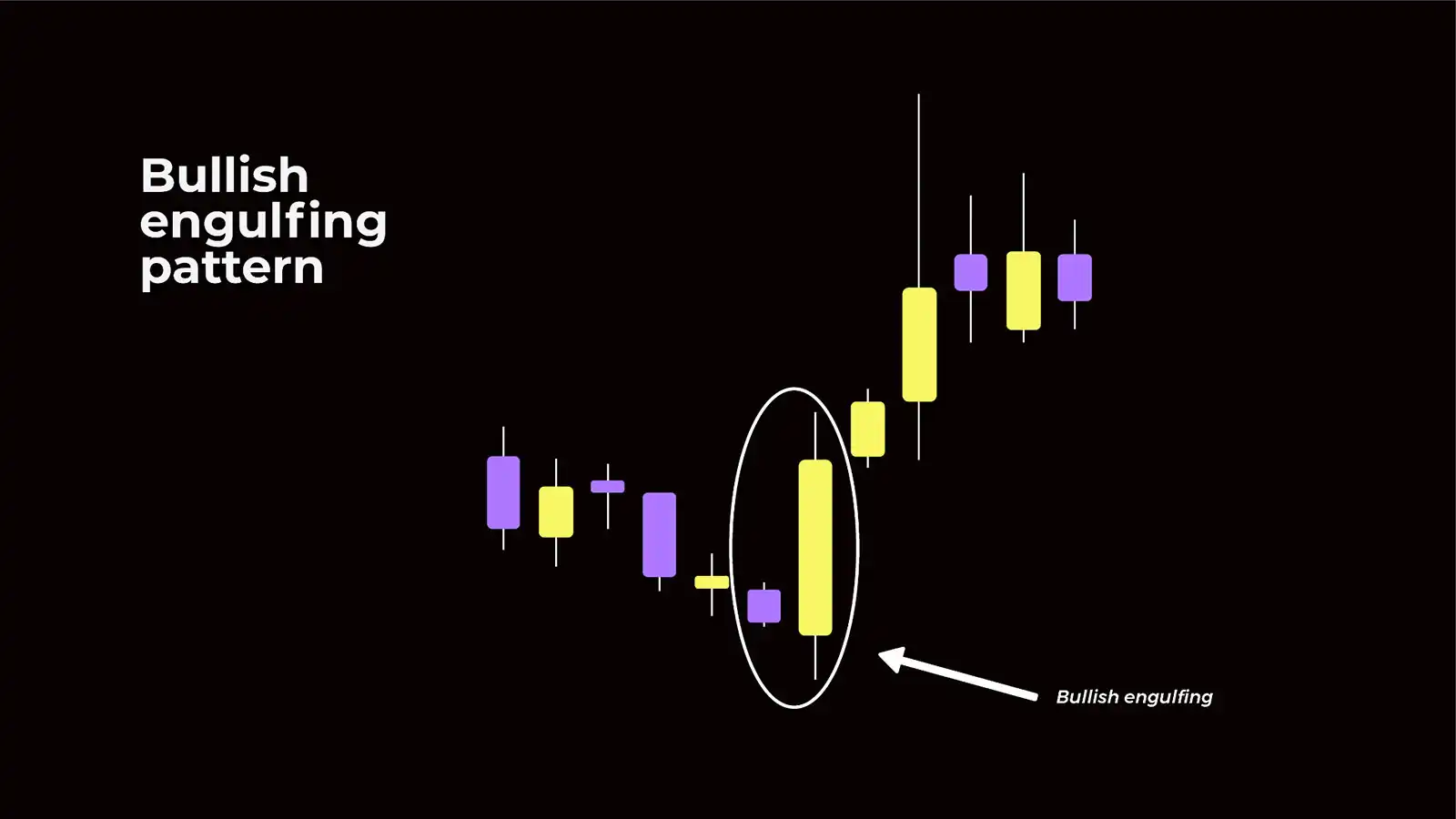 A Bullish Engulfing appears after a downtrend, where a large green (or white) candle fully covers the previous smaller red (or black) candle. This suggests that buyers have taken control, potentially pushing prices higher.