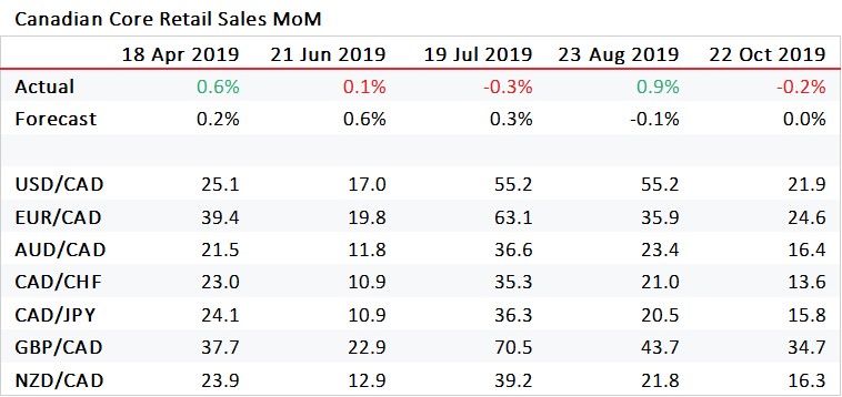The reactions on the tables are measured in pips by comparing the difference in the exchange rate five minutes before the event and five minutes after the event.