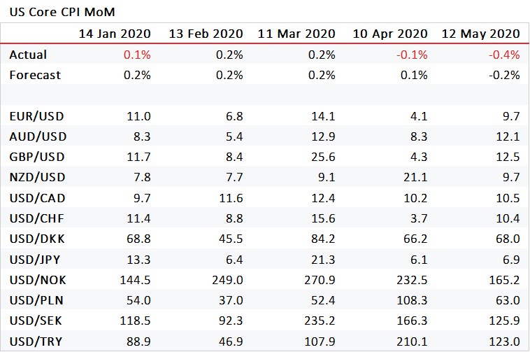 The reactions on the tables are measured in pips by comparing the difference in the exchange rate five minutes before the event and five minutes after the event.