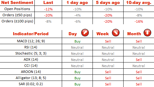 The share of the SWFX bulls was curbed by one more percentage point to 44%. Pending orders in 50 and 100-pip ranges from the spot have deteriorated and are now 54-60% bearish on EUR vs USD.