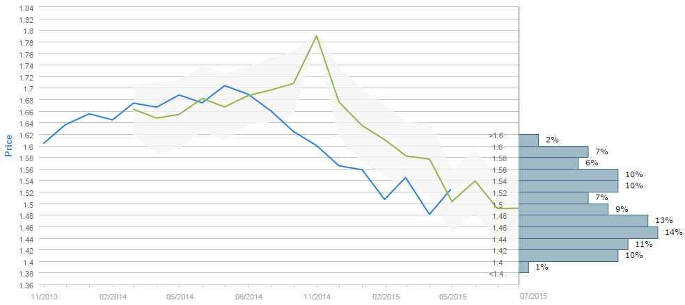 The majority of the community members, namely 58%, expect the Sterling to cost less than 1.50 dollars after three months. According to the survey, conducted from March 28 to April 28, the most popular price interval was 1.44-1.46, chosen by 14% of the participants. The second most popular price range was 1.46-1.48, selected by 13% of the surveyed.