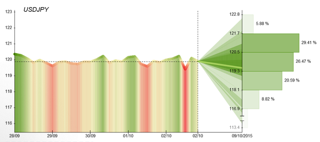 The USD/JPY currency pair was the least volatile last week, with pair's volatility moving into the turbulence zone only in 40% of the time. The Greenback started to post strong signals already at the beginning of the week and rose on Tuesday, after the release of upbeat US consumer sentiment data which added to hopes for a potential US rate hike later this year. US consumers spent another 0.4% more in August, after monthly gains of 0.4% in July and 0.3% in June. The price index for personal consumption expenditures, the US Federal Reserve's preferred inflation gauge, was flat from July to August and up only 0.3% from a year earlier. The Conference Board's index of consumer attitudes rose from 101.3 in August to 103.0 in September, above the expected 96.1. Nevertheless, the Dollar turned lower against the other major currencies on Friday, after a weaker-than-expected US jobs report for September.