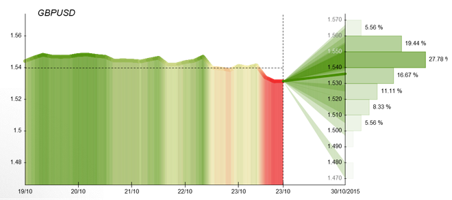 During October 26-30 time period the Dukascopy Community members assume this currency pair to rebound, as more than 56% of all votes are bullish. As predicted by traders, the GBP/USD may close around the 1.536 level this Friday. Speaking about the trader's opinions, nuonrg expects bearish development and states that "The 4 hour triple top held the pair capped and price dropped lower. I see the down channel continue to shape the pair with bottom around 1.497 level if it over reacts to the downside. From there it can bounce intermediate. Therefore, I am still bearish, unless price is picked up there by the market."