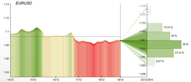 In accordance with the traders' uncertainty towards the pair's perspectives the EUR/USD experienced quite volatile development. The currency pair, however, started the trading week on a rather positive note around the 1.0989 level and rose up to 1.106 on December 15, after the German ZEW survey improved from 10.4 to 16.1 in December, while the current situation sub-index slightly accelerated to 55.0 from 54.4. However, the next day, pair experienced some looses and entered the negative territory for the rest of the week. On Wednesday, the Federal Reserve (Fed) kicked off a hiking cycle and raised rates by 0.25 bps to 0.5%. This was the first rate hike since June 2006. The dot plot was also more hawkish than expected and showed the Fed expects four additional rate hikes in 2016. Overall, in probably the most anticipated week of the year for most major currency pairs, the most scrutinized one - EUR/USD - did not surprise markets as it turned out the FOMC decision was well priced in. Therefore, the pair closed the week at $1.0860 level.This week the overall sentiment on the EUR/USD became clearer, compared to previous week. The 68% of Dukascopy Community members, is waiting for the Euro to drop further. The average prediction for December 25, in turn, is located around the 1.087 level. Concerning important events in the Eurozone this week, the flow of announcement will be limited, namely due to the Christmas Eve. Meanwhile, on Thursday, the US will produce data on initial jobless claims.