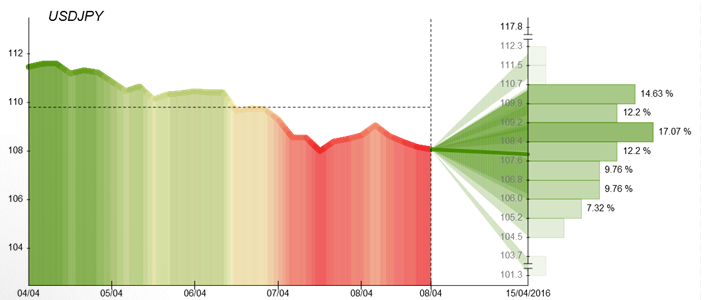 During April 4-8 trading week, the USD/JPY currency cross performed in a strong bearish trend, as the pair lost around 400 pips in five working days and crossed a number of considerable support levels being driven by negative American statistical data. The dollar lost pace against the Yen on Tuesday after Japanese wage data came in much better than analysts expected, suggesting the Bank of Japan's scheme to lift wages and boost inflation might be starting to pay off. Cash earnings surged 0.9% year-on-year in February, according to Japan's Ministry of Health, Labor and Welfare, far outpacing the 0.2% rise in earnings forecast by analysts. By the end of the week, the Japanese yen rose to a fresh October-2014 high against the US dollar on Monday, in what one expert says is due to a surge in speculative long positions. By the end of the week, the yen has strengthened very notably, which is causing concerns of a possible Bank of Japan intervention, although this has not stopped the yen's rally recently. Therefore, from Monday's mark of 111.7 the USD/JPY currency pair slid down to 107.6, just above the weekly S2. Dukascopy traders, in turn, predicted pure bearish trend for the pair.