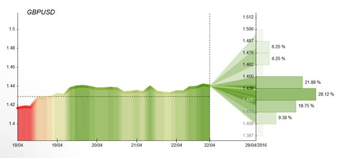 Majority of respondents claim the pair will depreciate over the period, while the pair is expected to finish the week at 1.423, just 16 pips lower from the last week's average price. However, keeping in mind the fact the pair was already trading lower at the moment of writing, bears can try to break daily S2 and S3 at 1.439 and 1.445, respectively. Moreover, market sentiment is strongly bearish (72%), while attitude towards the Sterling is bearish as well, with the currency being sold in 72% of all case across the board. Regarding the economic data, UK will release a first readout of first quarter gross domestic product on Wednesday as well as the Federal Reserve is to announce its benchmark interest rate and publish its rate statement in the same day.