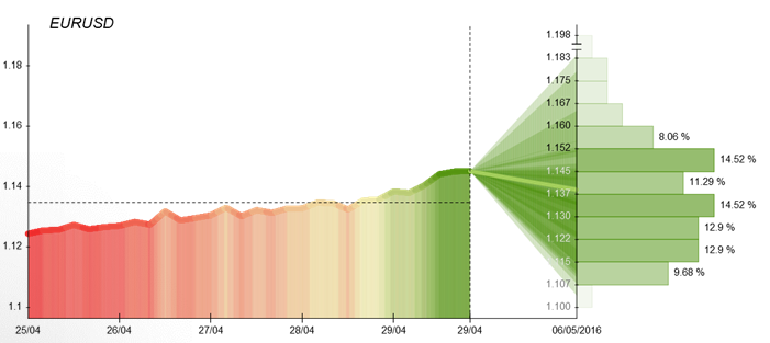 Even the most traded currency remained rather calm, with the elevated market volatility observed only in 24% of the time. The pair did not show rapid movements on Monday as there was no major impetus for any bigger movement. The next day, the Euro managed to receive support, rising 0.43%, after US durable goods showed a weaker than expected reading in March. In the middle of the week, the pair was rather calm, since the Greenback strengthened after the statement from the FOMC's as well as since Fed left the federal funds rates unchanged. Eventually at the end of the week, the single European currency pared gains, pulling away from a two-and-a-half week high due to the announcement of downbeat Euro zone inflation data. According to the Eurostat, the Euro zone economy grew by 1.6% year over year in the first quarter; however, inflation failed to keep pace, sliding 0.2% on a yearly base while core inflation rose 0.8%. Dukascopy Community members divided equally in their expectations, as consensus forecast stands for 1.137. Still, the level is more than 70 pips above last week's average price, meaning the pair is still trading in a strong uptrend. "The pair is running on an up trend touching the resistance level of 1,14639. The last 15 days draw a double bottom, around the EME(20), with a W shape around 1,2340 level. I am expecting a contra-trend move in the next few days going down to 1,1350" said trader Khimitau.