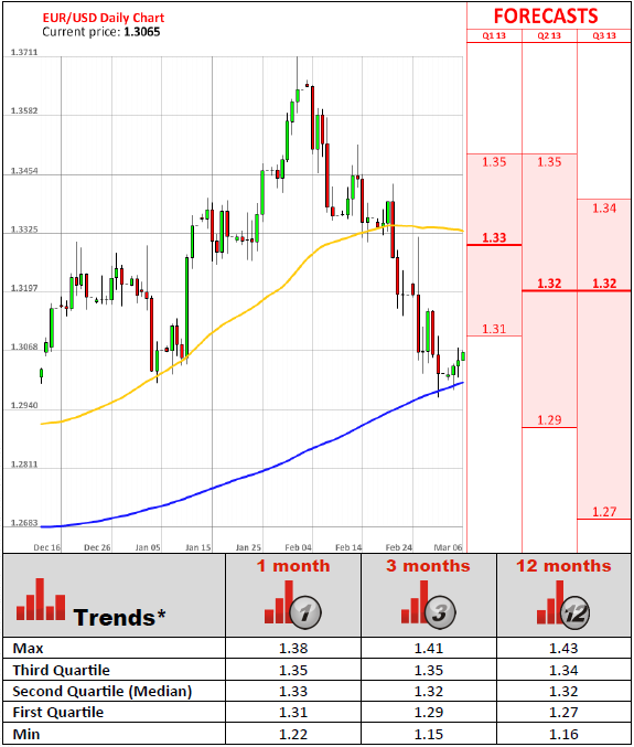 Activity of the service sector in the 17-nation currency bloc contracted further in February, however, at a slower pace than previously, according to the Markit Economics. The Purchasing Managers' Composite Index stood at a revised 47.9 last month, up from the initial reading of 47.3, but still well below compared to 48.6 in January and further away from the break-even mark of 50. That was the thirteenth consecutive month, when the reading stood below the 50 threshold. The final release of region's PMI survey is proving that the Eurozone's gross domestic product is still contracting. The region recorded a 0.6% drop in economic output in the last three months of 2012, and latest data are suggesting that region's economy is expected to contract further in the first quarter of 2013, before recording a marginal growth in the second quarter.