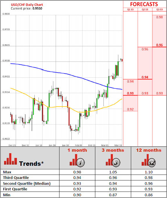 Consumer prices in Switzerland increased for the first time since October in February, however, remained in negative territory year-on-year, lending support for the Swiss National Bank's case to maintain its cap on the Swiss Franc. Prices were 0.3% higher from a month ago, while on a yearly basis, they dropped 0.3%, both meeting analysts' expectations. Core inflation, which excludes such volatile components like food, beverages or energy, tumbled 0.4% in February, the Federal statistics office said on Friday. In September 2011, the SNB capped the Franc to fend off deflation and recession and, according to the latest data, it is far from removing the cap, due to new risks faced by the Eurozone. Earlier this month a report showed that Swiss gross domestic product grew 0.2% in the fourth quarter of 2012, compared to a 0.6% rise in the previous quarter.