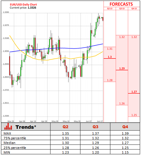 During the last policy meeting, Mario Draghi decided to leave key interest rate unchanged, however, slightly lowered its growth outlook and offered a raft of other policy options in case the economy does not emerge from its deepening recession later this year. In the meantime the malaise of the 17-nation economy was clearly visible in a 0.5% drop in employment in the first quarter of a year, while the jobless rate soared to a fresh high in April, with 19.4 million people being out of work.