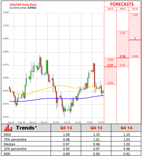 The Swiss National Bank is now expected to keep the ceiling on Swiss Franc for at least 1-2 years, suggesting there will be no shift in the franc's rate versus the single currency during the next six months. Despite healing economy, one of the major concern for Swiss policy makers remains the Eurozone, which has contracted the past six quarter, the longest-ever recession. At the same time Swiss first quarter growth outpaced even Europe's largest economy, and the SNB now projects a 1.5% expansion this year.