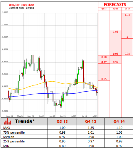 During July's policy meeting the Swiss National Bank's President Thomas Jordan said the bank has no intention to introduce any changes or even scrap a Franc ceiling of 1.20 versus the single currency. The SNB imposed the cap on the nation's currency almost two years ago, in September 2011, amassing foreign-currency reserves equal to almost 75% of Swiss annual gross domestic products, as a result of its market interventions to defend the limit. The abolishment of the ceiling is not an option at the moment, as risks of deflation and recession are still high, mostly due to a longest-ever economic slump in the Eurozone. The SNB now expected consumer prices to drop 0.3% this year.
