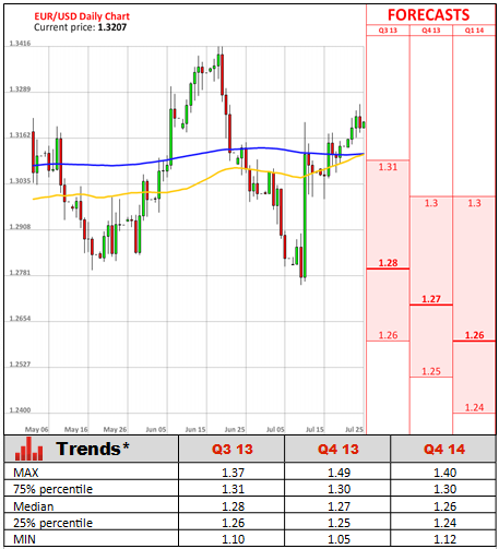 The manufacturing output across the 17-nation bloc that has the Euro in circulation surprisingly expanded this month for the first time in two years, suggesting Eurozone is pulling out of recession. A survey conducted by London-based Markit Economics showed that a gauge of manufacturing activity soared to 50.1 up from 48.8 in June, outpacing analysts' forecasts for a 49.1 reading and finally indicating expansion in the sector. The flash services PMI improved as well, reaching 49.6 compared with 48.3 a month earlier, when it recorded the weakest rate of contraction since January. Another bright spot came from the Composite PMI, which advanced to 50.4 from June, when index showed overall contraction of 48.7.