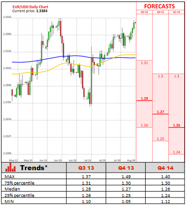 Meanwhile, German industrial production came better-than-expected in June. Industrial output jumped 2.4% in June on a monthly basis, compared to a revised 0.8% decline in May and forecasts of a 0.3% gain. The country's manufacturing output surged 2.2% in June, while production of investment goods and construction jumped 4.1% and 1.6%, suggesting that the economy of the currency bloc is stabilizing. Currently, investors are awaiting German and the Eurozone's GDP data due on August 14. The Eurozone's economy is likely to have stagnated in the second quarter and is expected to expand 0.1% in the third quarter.