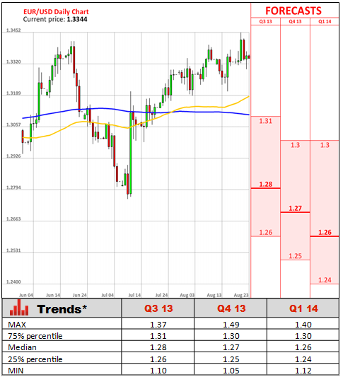 Another bright spot from Europe came out on Thursday, as activity in services sector expanded for the first time in 19 months, while the overall business activity grew at the fastest pace in 26 months, reinforcing a view the 17-nation economy is finally starting to gain momentum. A report from London-based Markit Economics showed that services PMI jumped to 51 in August, from 49.8 a month earlier, beating analysts' predictions of a 50.2 advancement. In addition to that, flash manufacturing PMI picked up to 51.3, compared with 50.3 in July, led by a strong improvement in activity in German manufacturing sector, where PMI hit 52.0 in August, following 50.7 points in July and reaching its highest level in 25 months. Meanwhile, the flash PMI Composite inched higher to 51.7 from 50.5 in the preceding month. Among other big countries, business activity in France, Europe's second largest economy, showed no change during August and still indicates a contraction, as manufacturing PMI stood at 49.7. The Eurozone gross domestic product expanded 0.3% in the three month through June, recovering from a six straight quarters of contraction. And even as the expansion was led by Germany and France, at least four European countries still remain in recession, including Spain and Italy. And the rising unemployment is still indicating there are continuing problems, which are needed to be sold before the bloc's economy will step on the path of sustain recovery.