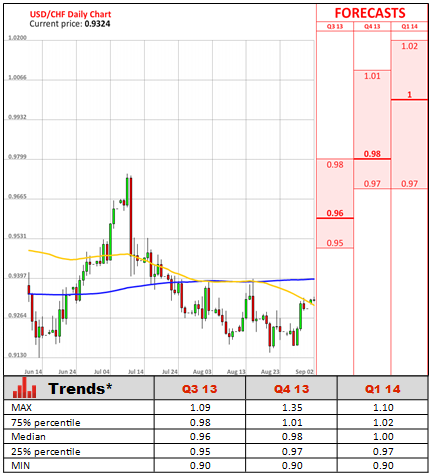 However, the upward movement of leading indicator suggests that Swiss economy will exhibit positive dynamics in the nearest future. The main reason for such suggestion is that the KOF barometer is based on three modules- core GDP, construction output and banking, which all moved in the positive direction. In June Swiss authorities upgraded its 2013 growth forecast to 1.4%, while the SNB still projects a growth of 1-1.5%. On September 3 Swiss statistical office will publish its second quarter figures and the better-then-expected reading of KOF leading indicator is adding to signs the growth can outpace analysts' projections.