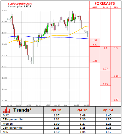 Meanwhile, the European Central Bank has revised up its forecast for the 17-nation economy this year, however, Mario Draghi was quick to end any speculation the bank will tighten its policy in response to the latest economic improvement. The ECB now expects the economy to contract only 0.4% this year, rather than the 0.6% contraction seen in June. However, the bank downgraded its outlook for the next year, saying the economic output should rise only 1% in 2014, compared with 1.1% estimated earlier. Furthermore, Draghi affirmed once again that consumer prices will stay comfortably below 2% target level both this year and the next one. He also stressed out, the Eurozone economy is now more likely to deteriorate rather than improve at a rapid pace, due to renewed geopolitical tensions.