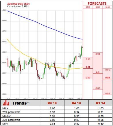 Supported by an improvement in the economy and brighter prospects, Australian leading index, which is designed to predict the direction of the economy, climbed 0.3% in July, recovering from a 0.2% drop a month earlier. A measure of current economic activity, however, fell 0.2%, following a 0.1% increase in June. Even though the latest data are indicating Australia is still struggling to gain the momentum due to a drop in mining projects, subdued consumption levels and unemployment rate at a four-year high, new government, and optimism among Australians, the $1.5 trillion economy is likely to recover in the foreseeable future.