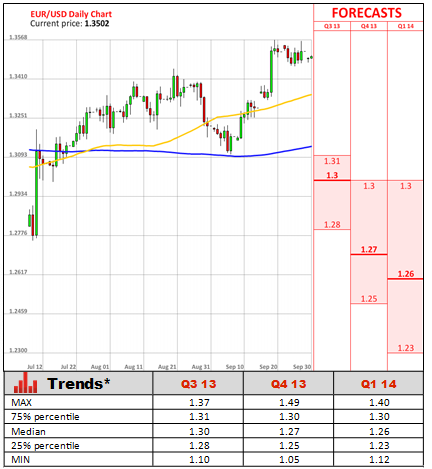 Faith in the 17-nation currency bloc has hit the highest level in two years this month, cementing expectations the recovery is underway. On Friday, September 27, the European Commission said a gauge of business morale soared to 96.9 in September, from August's 95.3, posting the best reading since August 2011 and prolonging a streak of five consecutive months of gains. Analysts, however, expected a slightly weaker figure of just 96.0. Moreover, sentiment among retailers advanced to -7 from -10.6 a month earlier, while managers were also particularly more upbeat about the present business situation. Consumers sentiment also continued the upward trend persisting since December 2012, as a measure of consumer sentiment hit -14.9 supported by more optimistic views on the future general situation.