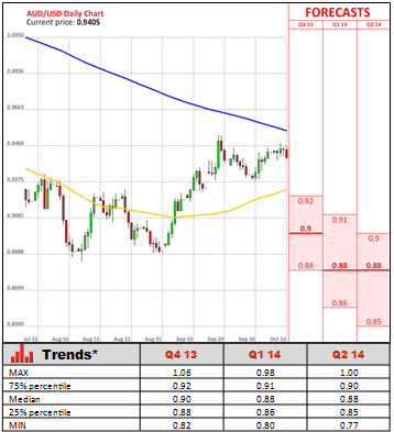 In September the gauge of consumer sentiment was boosted by a win of Liberal-National coalition, putting an end to three years of slightly chaotic minority Labor government. The newly-appointed Prime Minister Tony Abbott already promised to install greater prospects for Oz economy, which is struggling from a downturn in the key mining sector. Amid main factors that weighed on consumers' sentiment are a steady fall in stocks through the week (2% fall), and a constant increase in Aussie. Furthermore, growing uncertainty surrounding the U.S. government shutdown is also a huge drag on Australians' mood. Meanwhile, the Australian Bureau of Statistics is likely to show that unemployment rate has stalled at 5.8%, and the fact more consumers expect situation in the labour market to deteriorate further was also reflected in the survey.