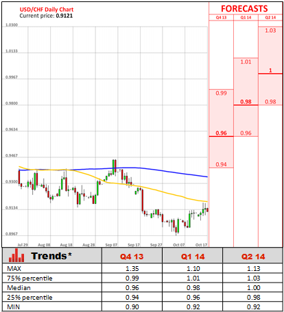 On the back of strong domestic demand and economic revival in the neighbouring Eurozone, Switzerland has been developing at a stable pace during the last several months. In addition to that, the pace of growth is likely to accelerate as economic expectations soared to the highest in almost 3 1/2 years this month. Hopes that the Eurozone economy will boost growth in the Alpine country lifted a measure of investor and analyst expectations to the highest since May 2010. A survey from the ZEW Institute and Credit Suisse Group said the index hit 24.9 points in October, up from 16.3 a month earlier, reflecting the number of participants, who expect the economic outlook to brighten, is higher than the number of pessimists. The reading couples with the equivalent October ZEW research in Europe's powerhouse, Germany, where the similar measure climbed to the highest October 2010, amid signs a broadening economic recovery.