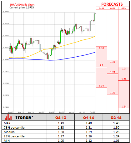 With the Euro trading versus the United States Dollar around this year's high, European exporters may start to suffer from the strong single currency, posing a threat to region's recovery. Furthermore, on November 7 the European Central Bank is gathering to decide whether to make any further adjustments to its policy or stay pat and see how effects of previous reductions are spreading through the economy. According to the majority of analysts, Mario Draghi will refrain from any additional stimulus measures. However, French Industry Minister Arnaud Montebourg said the ECB should lower the Euro's exchange rate versus the greenback as such measure could help the French economy. According to their projections, a 10% in single currency's value would add extra 1.2% to GDP, create 120,000 new jobs and cut the deficit by 12 billion euros. In addition to that a 20% depreciation, France will create 300,000 working places and deficit will reduces by 30%.