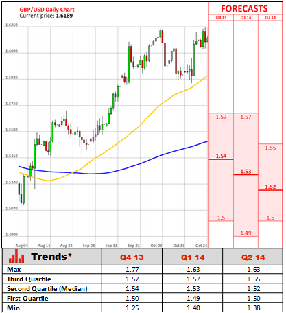 As it was widely expected BoE policymakers were unanimous during October meeting on both the interest rate and stimulus programme. All nine members decided to keep the key rate at 0.5% and the level of asset purchases at 375 billion pounds. They also agreed no additional stimulus is needed, as economy is building up steam. Additionally, officials said the unemployment rate is falling significantly faster than anticipated in August, signalling they can bolster its forward guidance, shedding the light on what will happen with the main interest rate if recovery accelerates further. In August BoE Governor Mark Carney introduced widely-discussed forward guidance, saying the central bank will not raise the key rate at least the jobless rate hit 7%. However, he did not specify what would happen in case it falls below the threshold level. As the economy is improving at a stable pace, the unemployment has already fallen to 7.7% in August, and uncertainty is growing what actions the MPC will undertake if the labour market continues to strengthen. The BoE said a hike in interest rate is unlikely before mid-2016; however, investors are betting on a faster increase in borrowing costs. Later this week a report from the ONS is expected to show the economy expanded 0.8% in the third quarter. However, a recent 4.6% Sterling appreciation is expected to dampen import price inflation as well as weigh on export growth in the medium term, according to BoE projections.