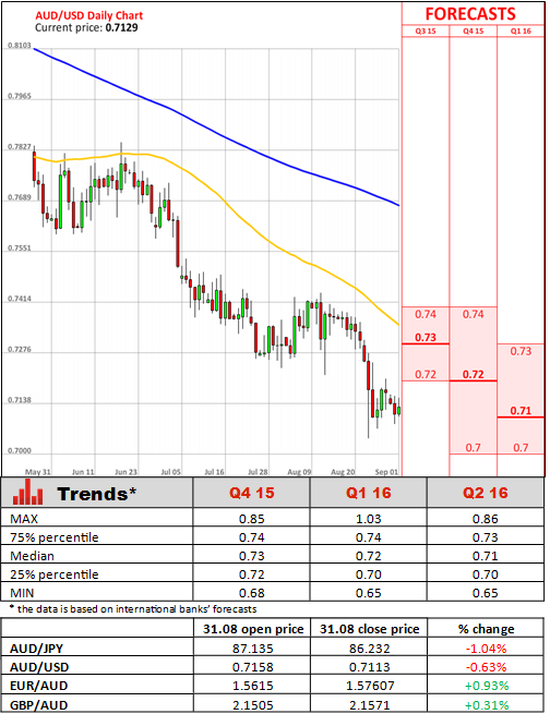 The Reserve Bank of Australia kept interest rates on hold at 2% after the recent stock market turmoil as a weaker Australian Dollar and past rate cuts have a positive impact on growth. The central bank said the Australian Dollar was adjusting to the significant drops in key commodity prices. Since the August meeting, the Aussie has lost 2.5% versus the US Dollar and 1% on a trade weighted basis. Meanwhile, the price of iron ore, Australia's biggest export, has jumped 5%. At the same time, there have been signs that the Fed may postpone its widely anticipated September rate hike due to ongoing concerns about cooling China's economic growth and turbulence in global equity markets. Economists believe the longer the US central bank holds off lifting rates, the greater the chances of further easing from the RBA. Yet, most analysts expect Australia's central bank to remain on hold for a while now, with a small share expecting one more cut, and markets pricing in around 30 basis-points cut in the year ahead.