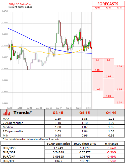 In regards to consumer prices across the Euro zone, they dropped 0.1% year-on-year in September after an increase of 0.2% in August, while markets expected to see the gauge flat in the reported month. This was the weakest number since March when consumer prices also fell by 0.1%. September's decline in consumer prices was primarily driven by a renewed drop in crude oil prices that tumbled 8.9% annually after a fall of 7.2% in August.