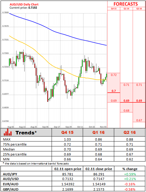 The Reserve Bank of Australia refrained from slashing the official cash rate amid signs of an upswing in business morale, but signalled that subdued inflation gives scope to cut rates if needed. The RBA kept the benchmark rate at a record-low 2.0% for a sixth consecutive month. Financial markets are now pricing in a 32% chance of a rate cut in December, down from 70% before the central bank's decision. Prospects of more official interest rate cuts remain on the table given the RBA's determination to keep downward pressure on the Aussie Dollar, which is helping boost the competitiveness of exporters. Moreover, any delay in the Fed's decision to hike rates may force the RBA to deliver additional cuts to the official cash rate.