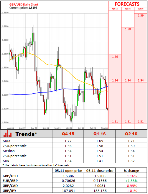 The BoE downgraded its forecast for economic growth for this year and 2016 and warned emerging markets could struggle with slower growth. The central bank expects the British economy to grow 2.7% this year and 2.5% in 2016, whereas in 2017 GDP is predicted to increase 2.7%. Inflation is projected to pick up over the coming months, but less quickly than projected in August, with inflation hitting the target in about 2 years' time. The central bank said that consumer price growth is likely to stay below 1% until the second half of 2016, due to lower costs for energy, food and other imported products. Moreover, Pound's appreciation since March 2013 is also contributing to the current low inflation rate. Economists expect a first interest rate rise by the BoE in the second quarter of 2016.