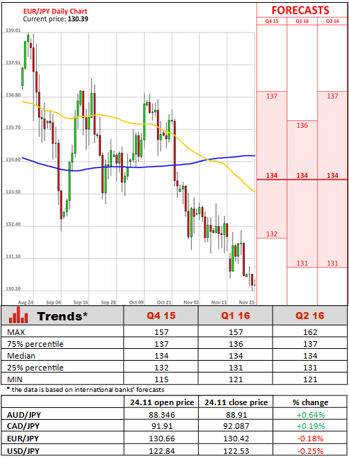 Minutes of the latest Bank of Japan meeting showed that officials reiterated the view that the world's third biggest economy continued to recover moderately, despite exports and production remaining more or less flat due to the effects of the slowdown in emerging markets. On the domestic side, the central bank saw private consumption staying resilient and labour market conditions continuing to improve steadily. With regards to inflation, some members of the BoJ's policy board assumed that an output gap was one reason Japan's economy was taking longer to meet inflation targets, highlighting a lingering worry that the delay in reaching the 2% inflation target meant that QE had been ineffective. At the meeting on October 30, the BoJ pushed back the timing of hitting its 2% goal by six months to the second half of fiscal 2016 due to weak oil prices.