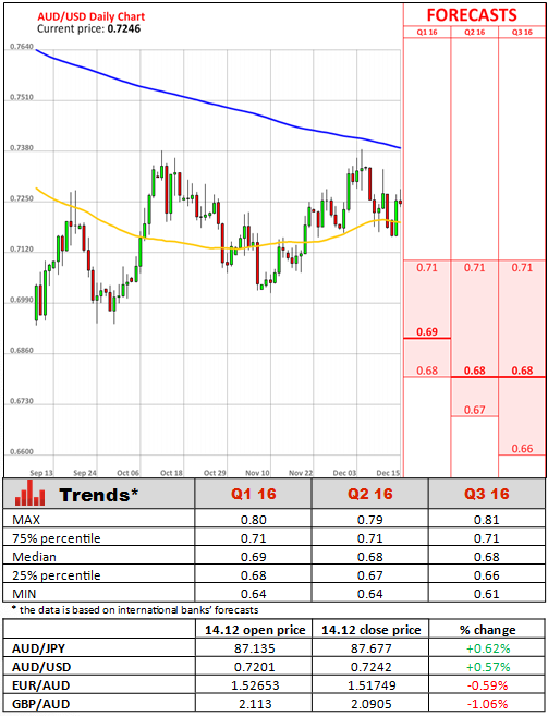 The RBA noted robust employment growth and survey showing above average conditions for companies. October's labour data surpassed even the most upbeat forecasts, with job growth soaring by 56,100, pushing the unemployment rate to 5.9%, down from 6.2%. Australian firms in industries such as tourism, education and manufacturing have been aided by a 30% plunge in the Australian Dollar since the beginning of 2013. The central bank is also waiting for the Fed's rate decision later in the week, when policy makers are expected to start normalizing its monetary policy for the first time in almost a decade, potentially exerting a downward pressure on the Australian currency as a rate differential narrows.