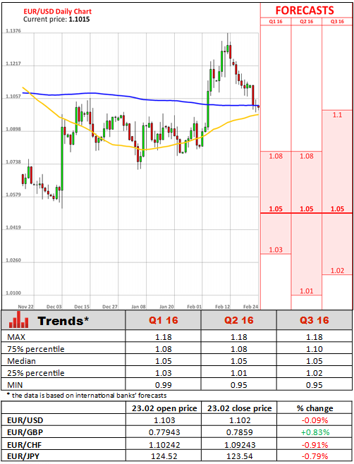 German business confidence declined for a third consecutive month in February, as the outlook among manufacturing companies plummeted at the sharpest pace since shortly after the Lehman Brothers bankruptcy in 2008. According to Ifo economic institute, the business climate index declined to 105.7 in February, down from 107.3 a month earlier. China's slowing growth is hurting global trade and hurting German exporters, with net trade dragging on economic growth last quarter. Business expectations declined sharply to 98.8 from 102.3 in January, while current conditions climbed to 112.9 from 112.5 last month.