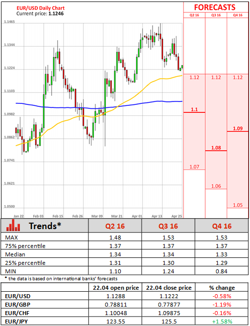 The Euro zone's private sector kept expanding moderately in April, but failed to gather momentum. The Markit Composite PMI, a forward-looking reading tracking development in the Euro bloc's manufacturing and services sectors came in at 53.0 in the reported month, down from 53.1 seen previously, when it rebounded from February's 13-month low. The manufacturing PMI declined to 51.5 in April, compared with 51.6 in the preceding month, while the services sector gauge rose to 53.2, slightly ahead of 53.1 in March, but undershooting economists' expectations of 53.3. The Euro zone's economic growth continued to be weak as the bloc's GDP expanded 0.3% in the final three months of 2015 on a quarterly basis, the same pace as in the three months through September. For all of 2015, economic output of the 19 countries using the Euro was up by 1.6% year-on-year.